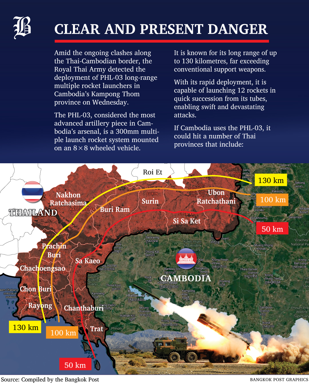 At 10.42pm on Wednesday, a firefight broke out when Cambodian forces fired on Thai positions using artillery and mortars. They also deployed unmanned aerial vehicles to conduct surveillance over several critical areas, including Chong Bok, Chong Sa-ngam, Chong An Ma, Prasat Khna, Prasat Ta Khwai, and Preah Vihear temples.