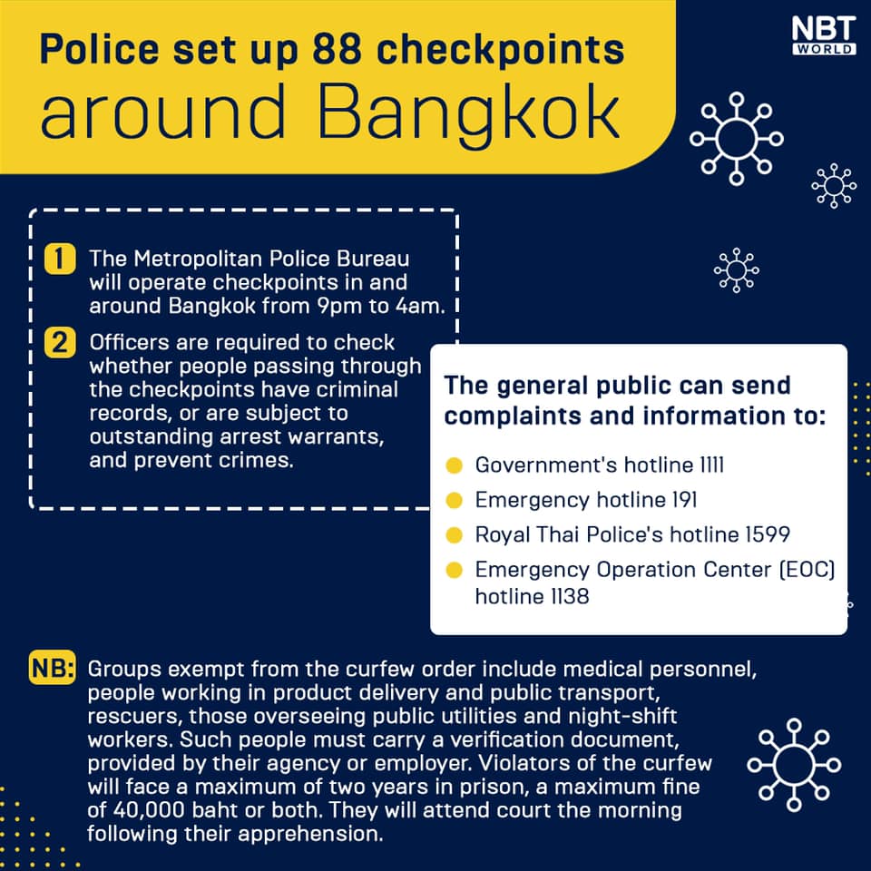 The MetropolitanPolice Bureau set up 88 checkpoints in Bangkok and deployed mobile units to prevent breaches of a curfew, imposed to help limit the spread of COVID-19.(NNT)